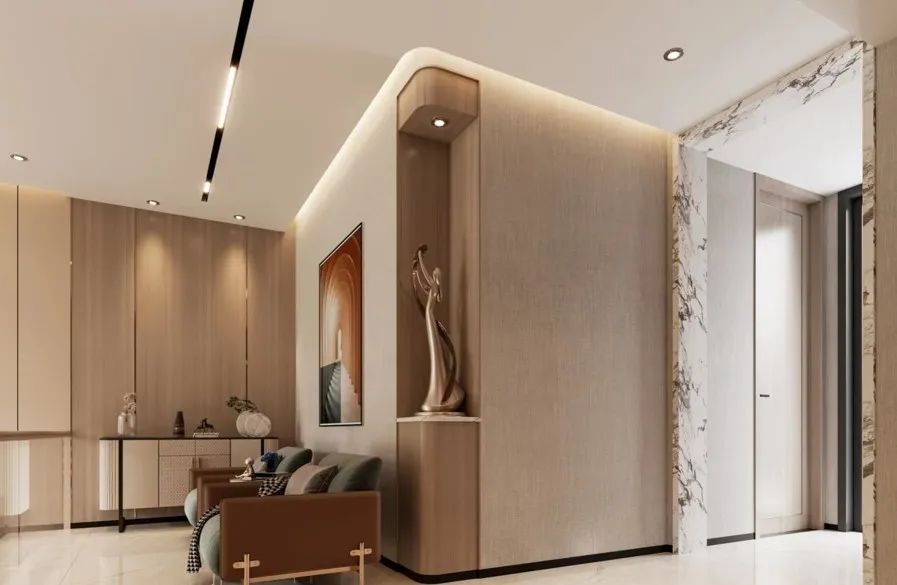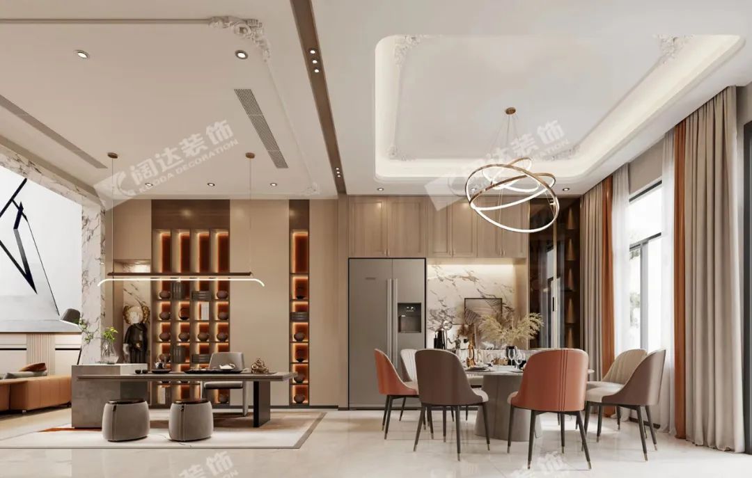 客廳溫暖明亮,經(jīng)濟耐看是本案的主要需求之一,剔除了法式復雜的線形后,融入了現(xiàn)代溫暖明亮的暖色系風格,材質(zhì)上搭配巖板,給予了視覺上的沖擊力,成為業(yè)主期待的理想之家。