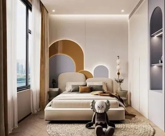 二樓:法式輕奢的主臥地面鋪木地板,定義靜謐舒適的氛圍,點綴金屬元素的壁燈和柜子,質(zhì)感和輕奢氣息油然而生。孩子的臥室則更加童趣。