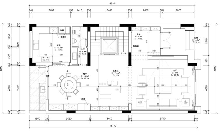 一樓通過改造擴大了餐廳面積,同時新設了茶區(qū)的功能。色彩和材質(zhì)的搭配讓整個空間更明亮干凈。