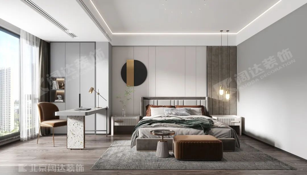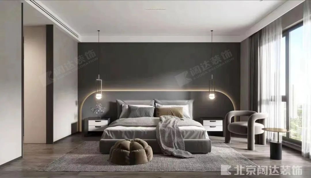 主臥空間的處理趨于簡潔。床頭背景采用了灰色混油面板,使用了柔和的線條燈,除了美感之外,渲染出親切的生活底色。